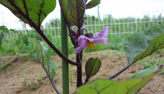 家に戻り畑を見るとナスが咲いていた。