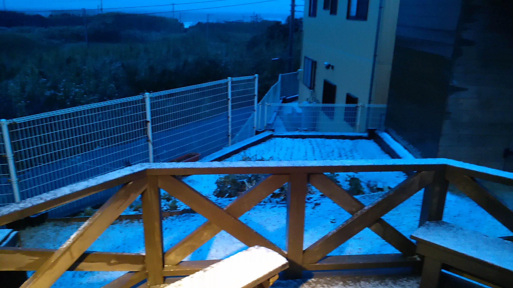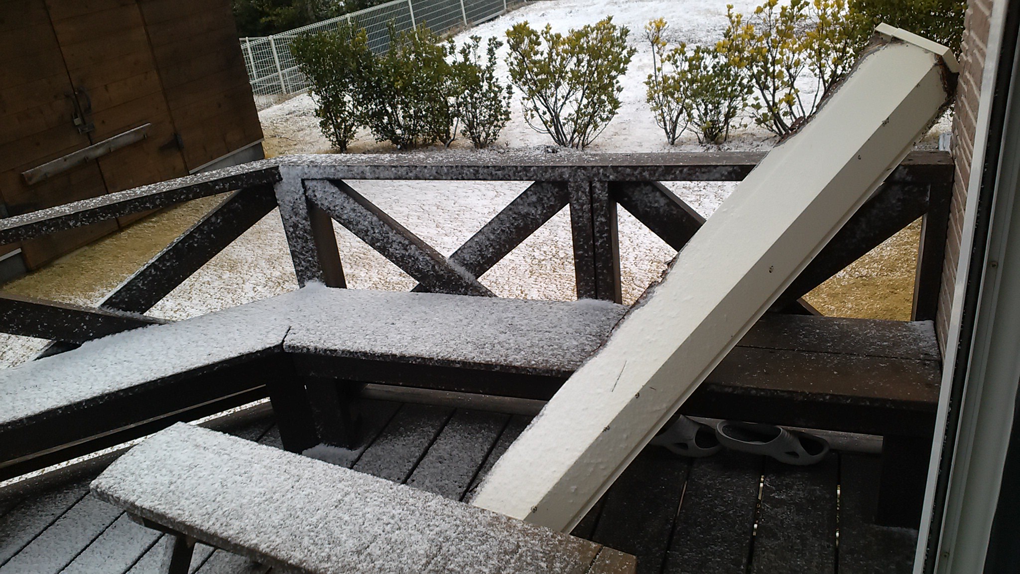 朝起きて明るくなってきたからシャッターを開けると雪。