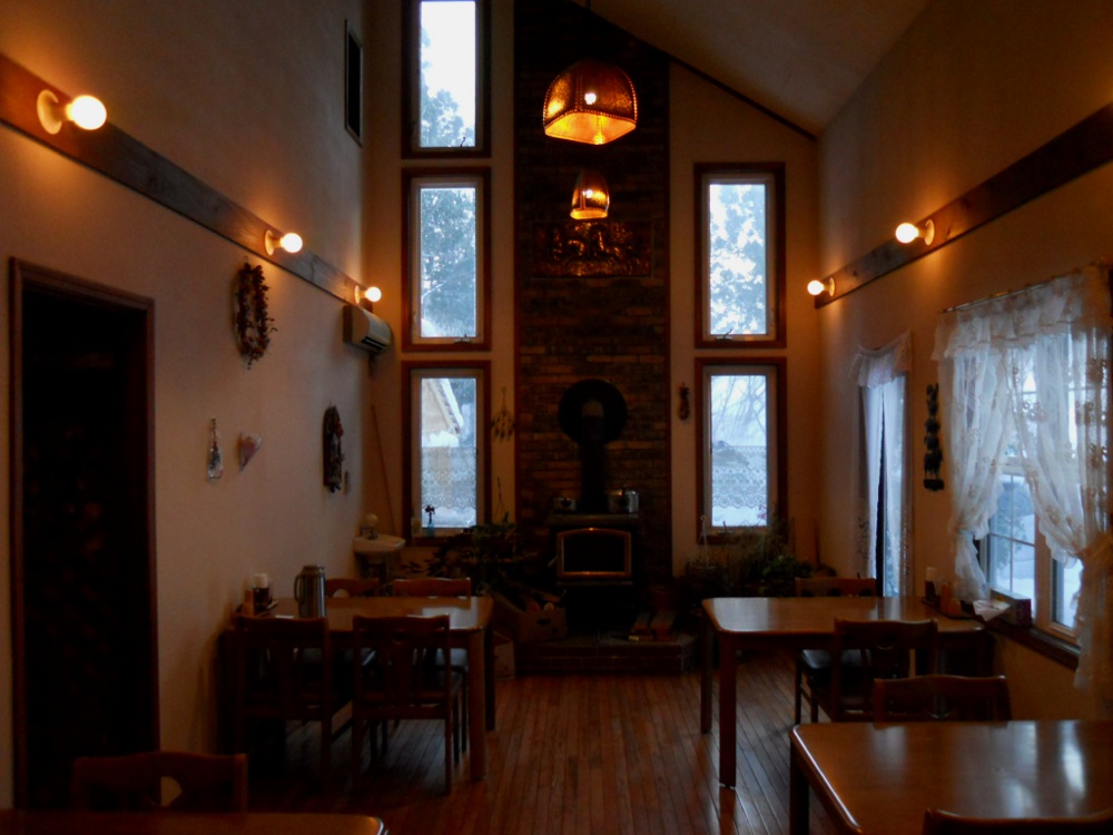 食堂には暖炉があって山小屋を感じさせる。