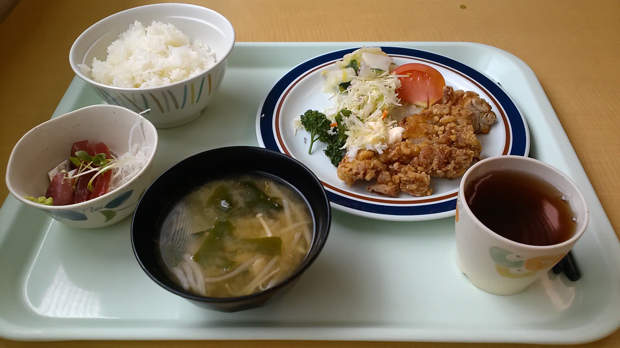 ちょうど昼ご飯で竜田揚げに刺身セット。