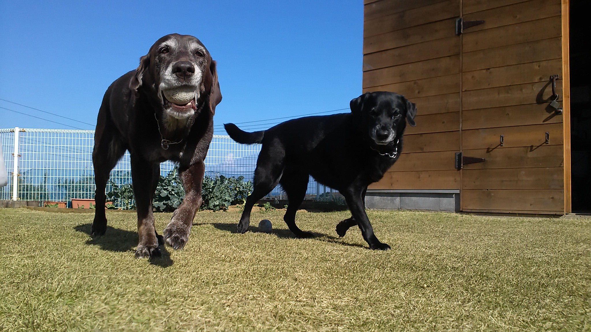 庭でボール遊びをしながら