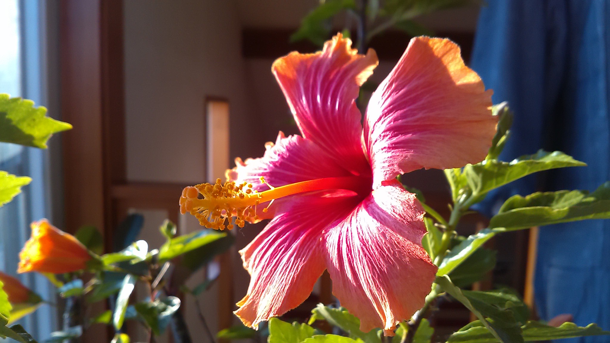 家に戻ると太陽が出てきてハイビスカスを照らした。