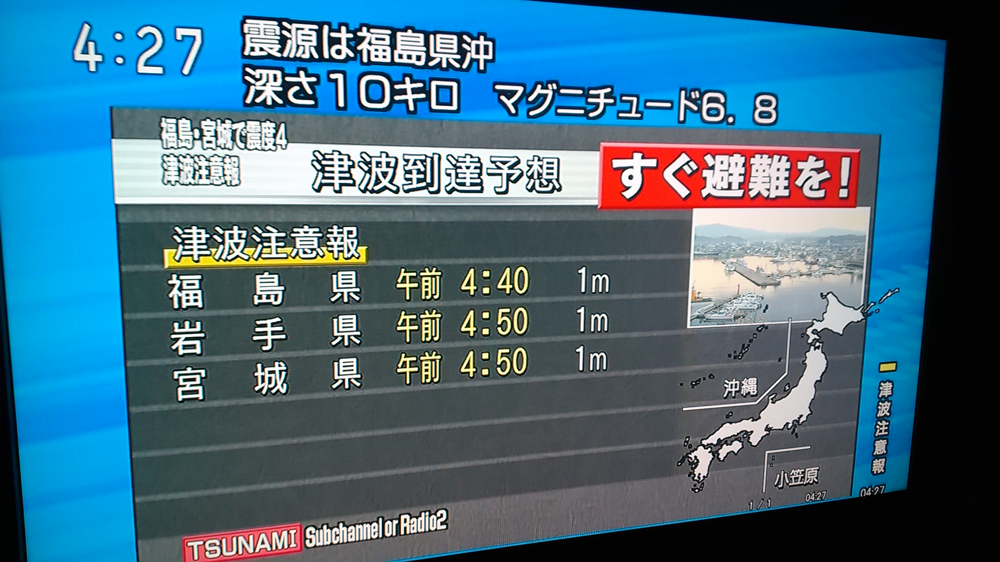 テレビを見ると津波注意報。