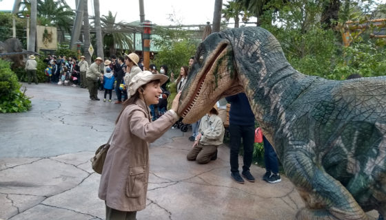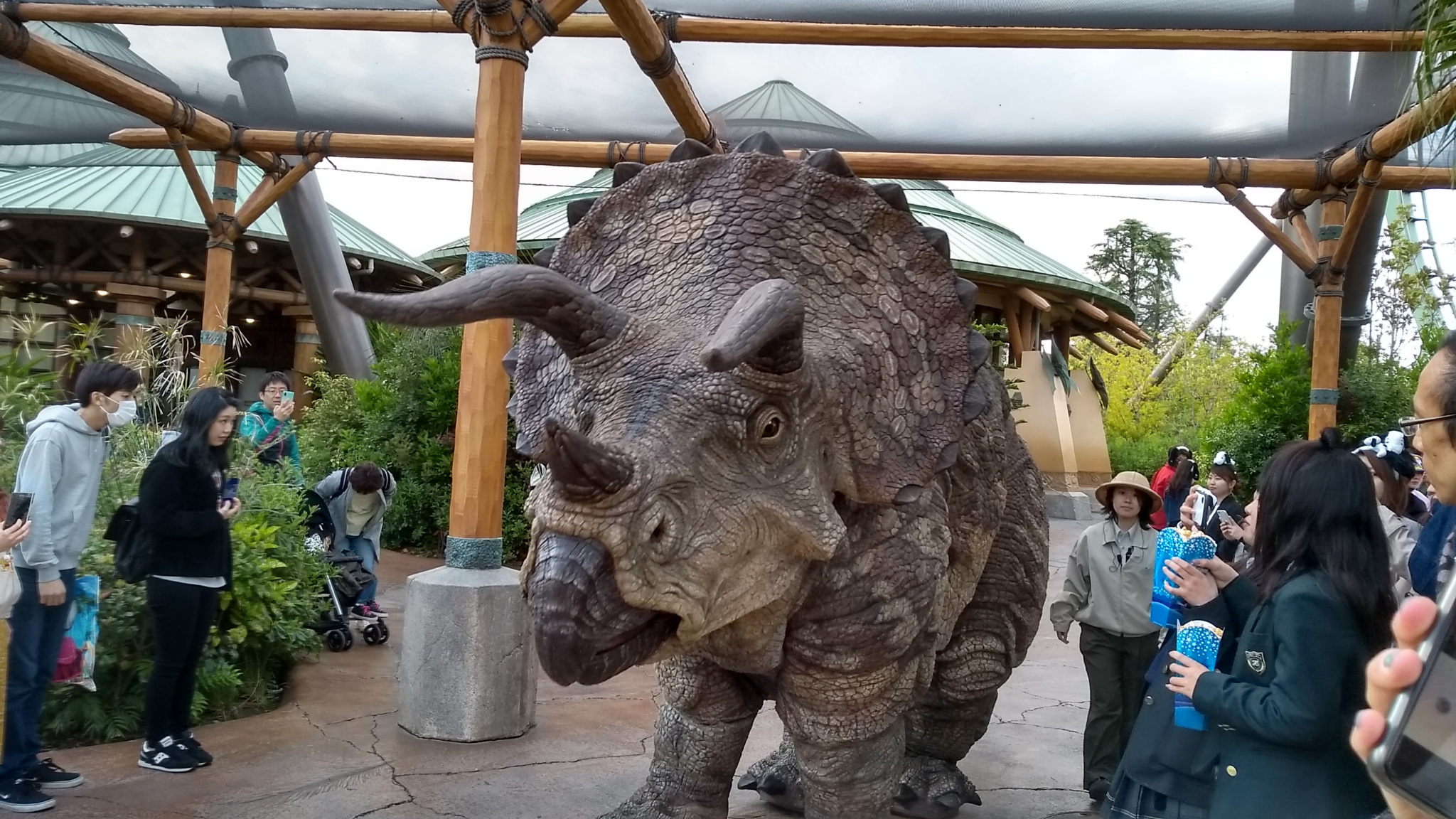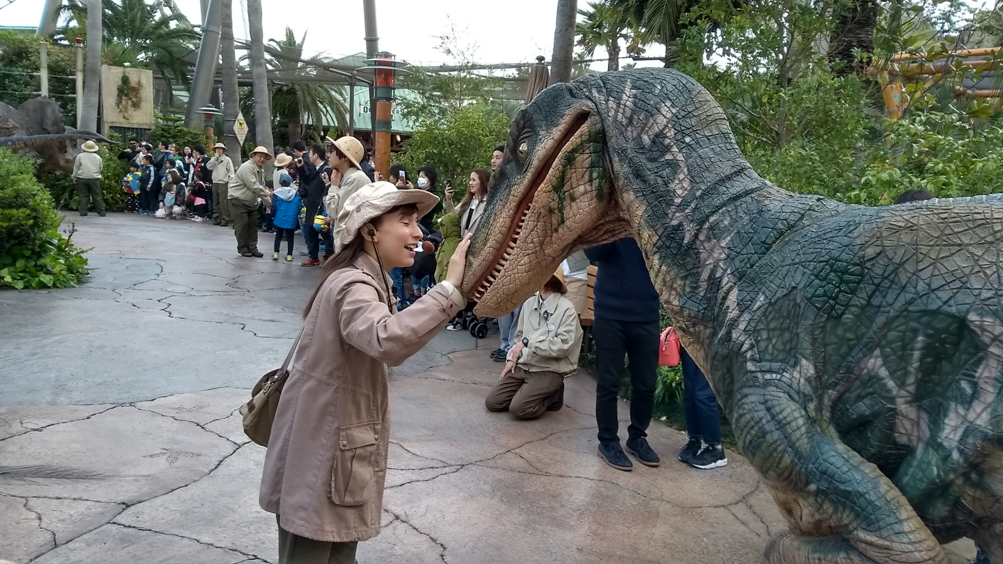 恐竜を手なずけるスタッフ。