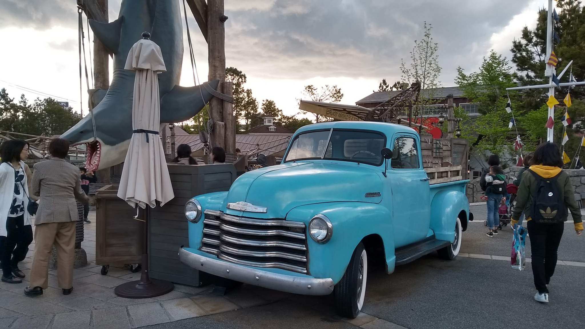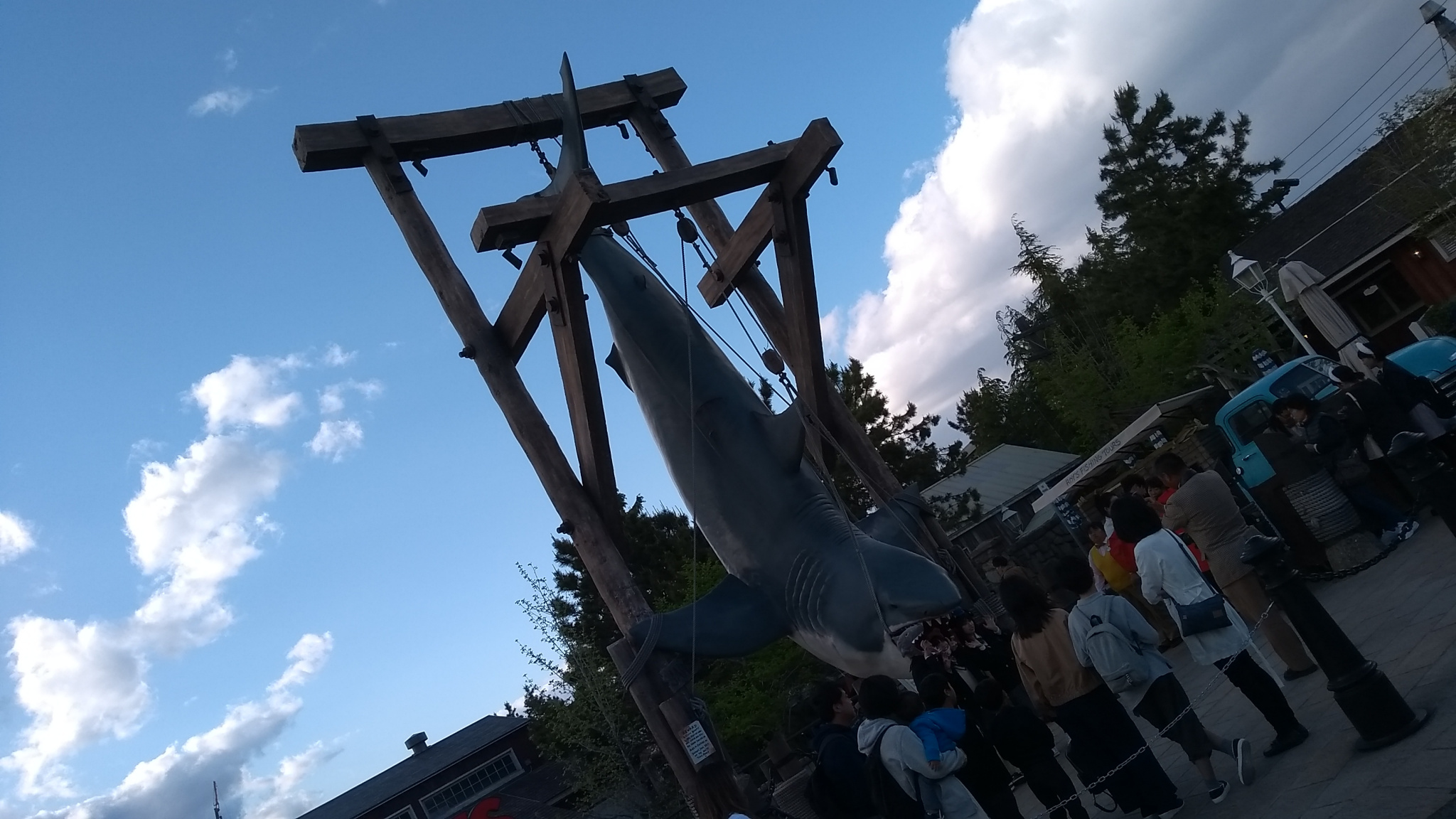サメをつるした場所が撮影スポット。