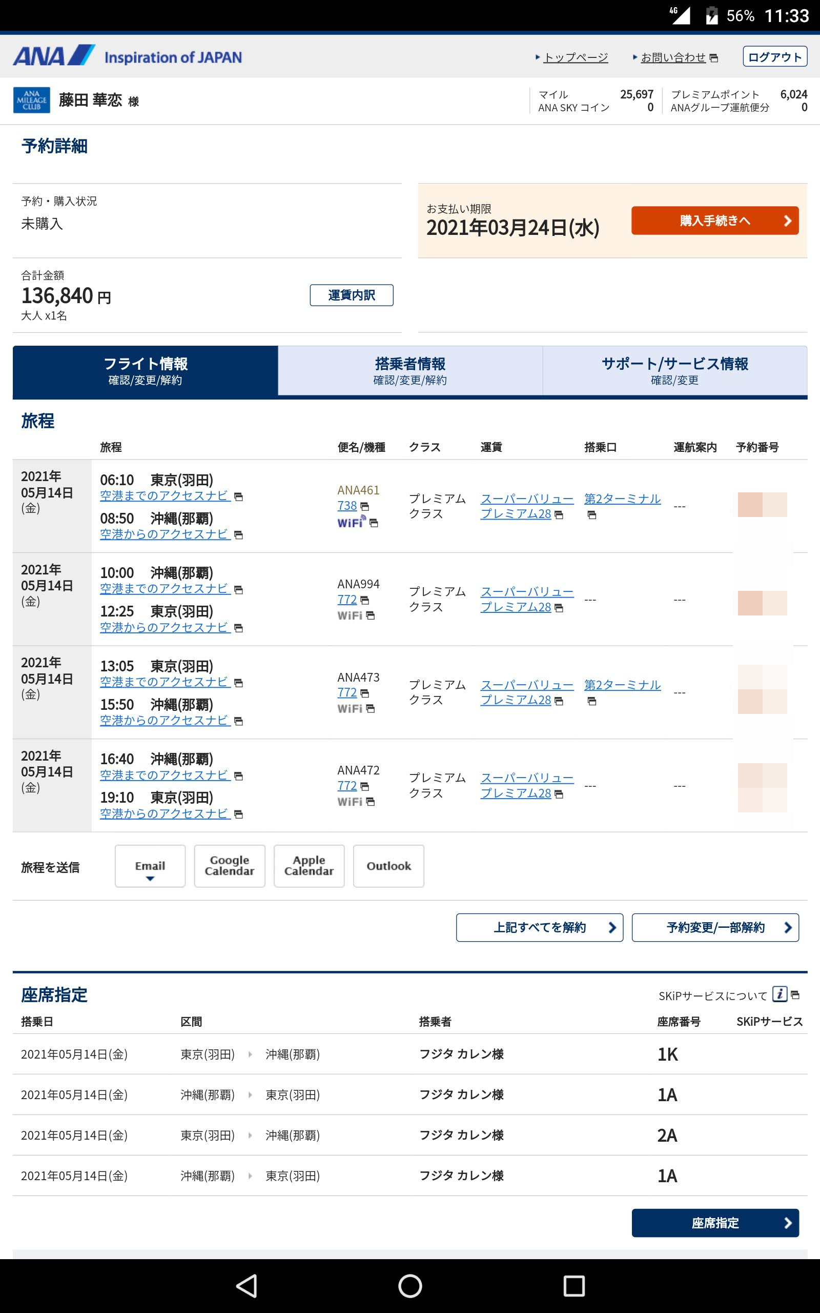 まずは4フライト予約。