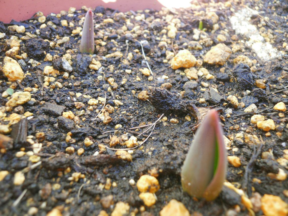 この寒さを耐えてチューリップが発芽。