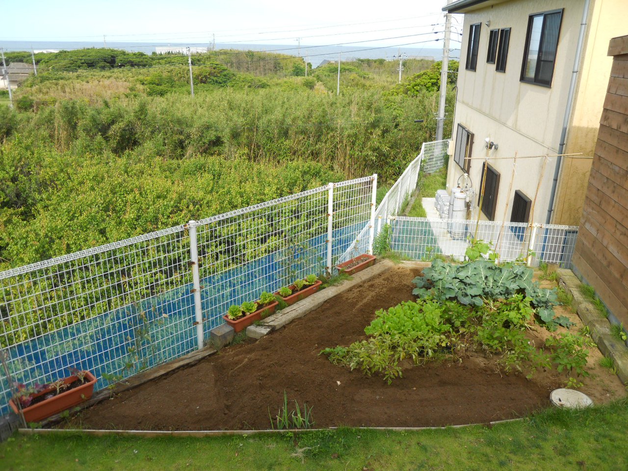 畑を耕して余っている枝豆とサンチュの種を蒔いた。