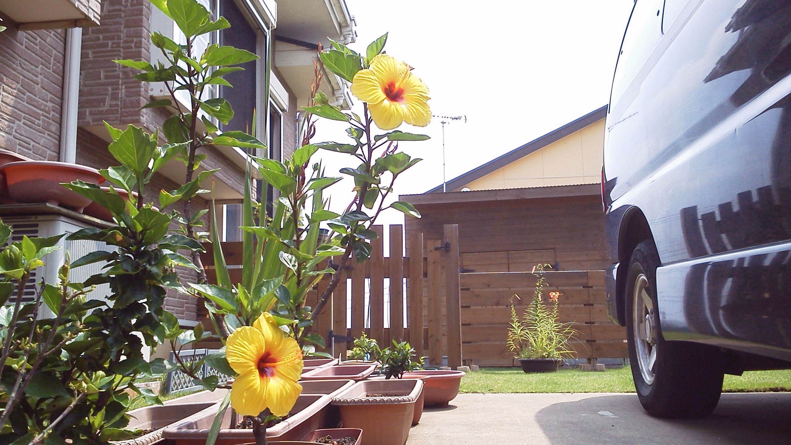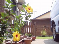 黄色のハイビスカスが2つ咲いて気温も高い。