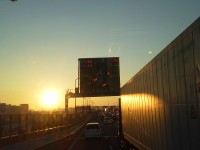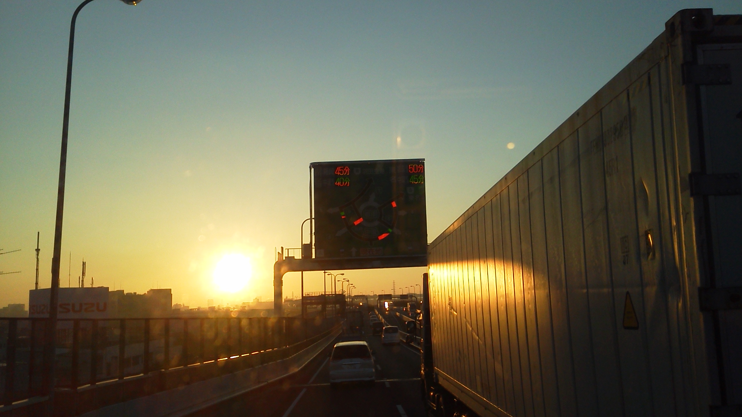 大渋滞の首都高で朝日が昇りだした。