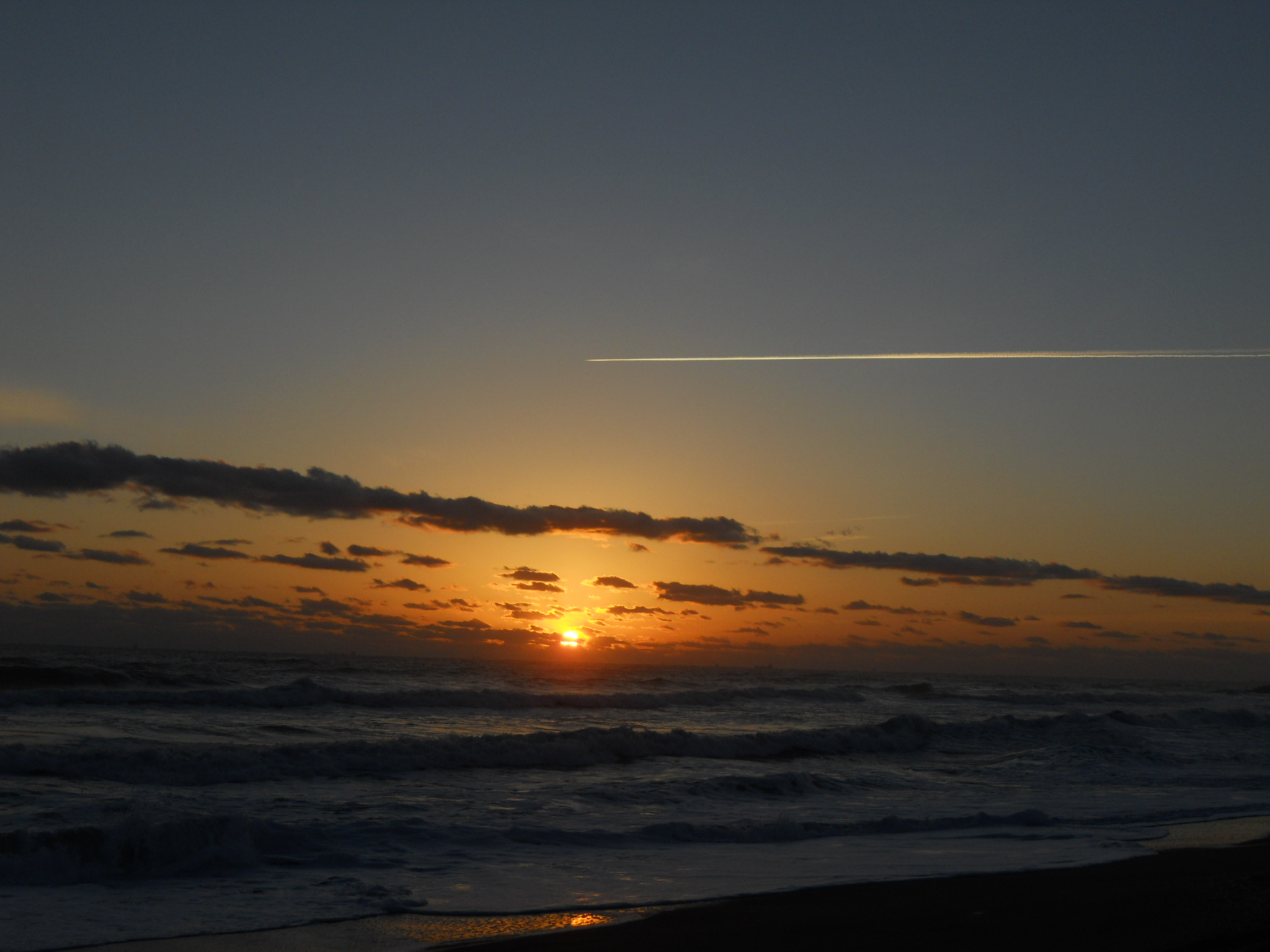 飛行機雲も綺麗に照らされて流れ星のよう。