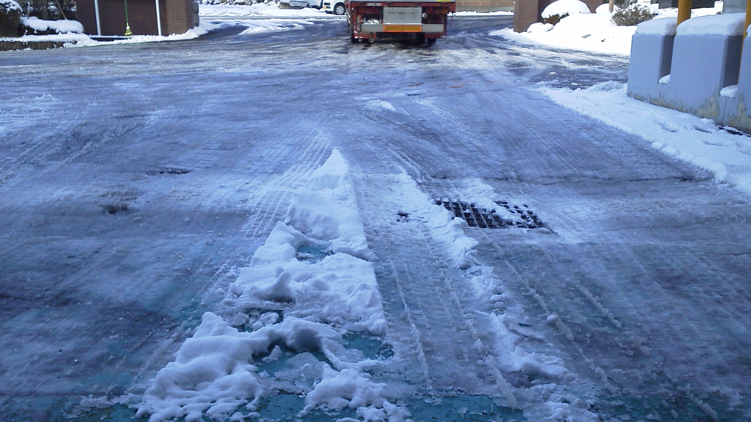 裏道の狭い場所が入口で圧雪されたツルツル路面。