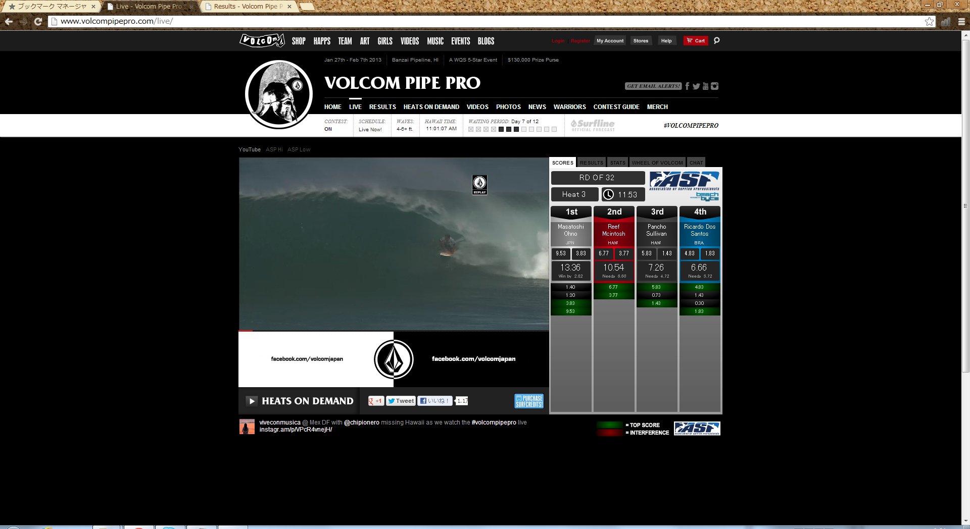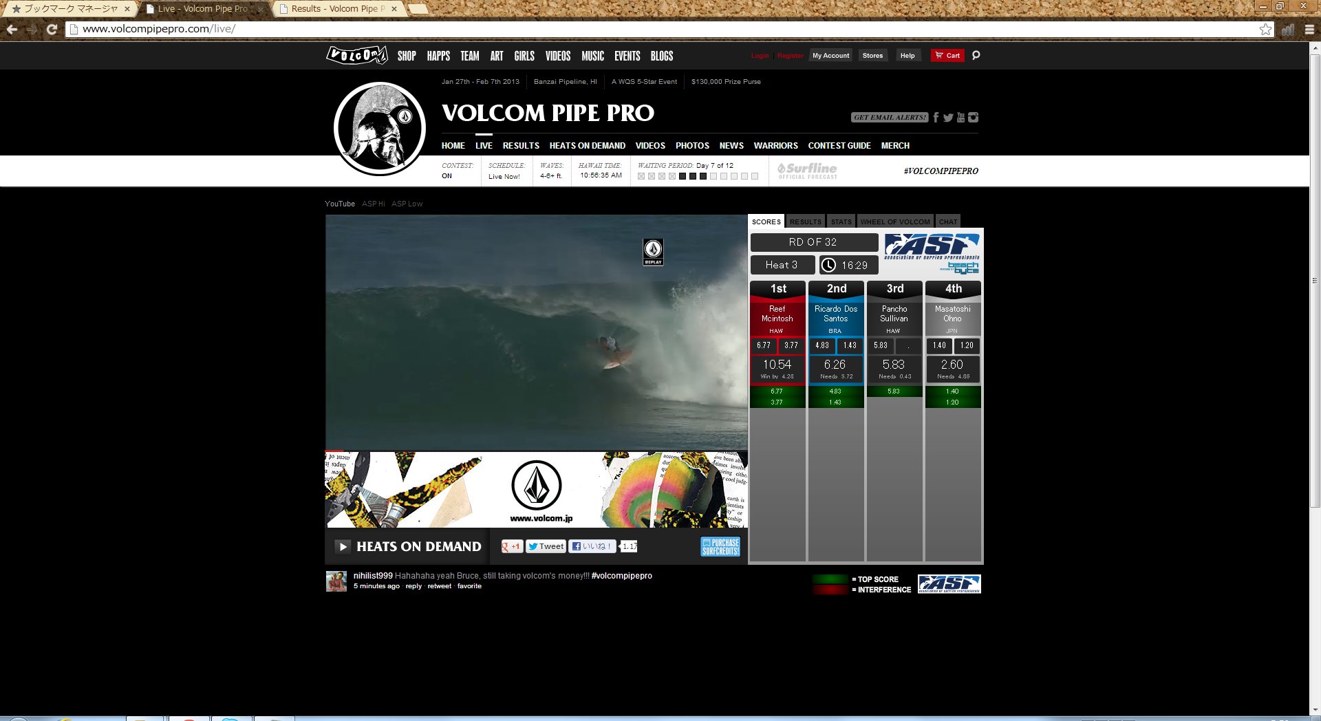 朝起きてからはVolcom Pipe Pro 2013の観戦。