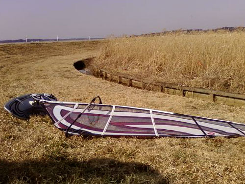 気持ちのいい強烈な風で一日楽しめた。 夕暮れが迫ってる頃 仲間が湖真ん中で走れずに流されている。 風下へ俺も走り安否を確認すると大丈夫だと言う。 もう少し俺も楽しんで様子をみても帰らない。 これはまずいと思って迎えに行った。 するとジョイントが抜けてしまい引っ張っていくとのに。 その頃には風も無くなり引っ張るのは大変だった。