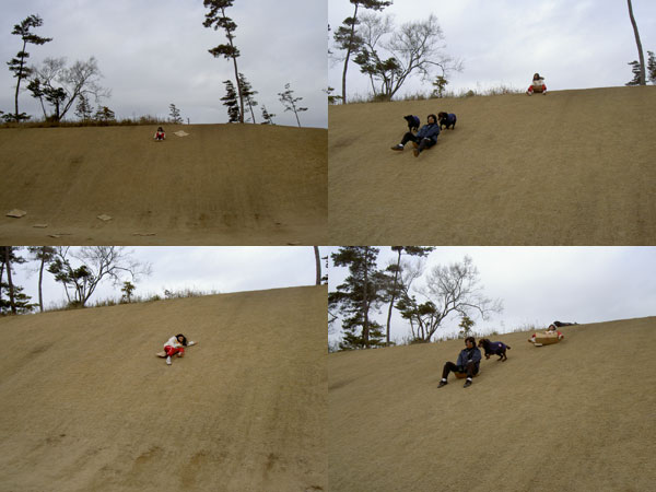 到着すると芝の坂を利用して ソリ遊びのようなことが出来る。 ダンボールが置いてあり早速トライ。 思いのほかスピードが出て面白い。 急な坂で犬たちも上り下りが大変そう。