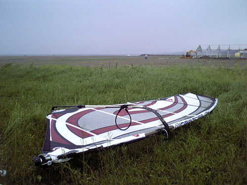 予報では何気に吹く予報で 帰ってきてから正面でウインドをセット。 思ったほど風も弱くゲッティングすら出来ない。 風が弱いからあきらめれ帰ろうとすると ビーチブレイクにやられセイルとバテンの破損。