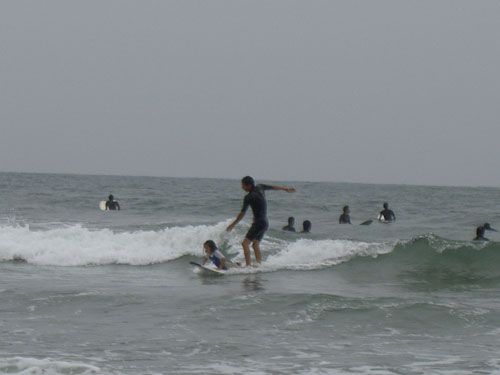 まずはチビから。 少しアウトまで行って選んで乗ってた。 しばらく乗って俺のロングでタンデムしたいと言うから 大き目の波を選んでタンデムライド。 2人とも立てて練習すればもっと楽しめる。