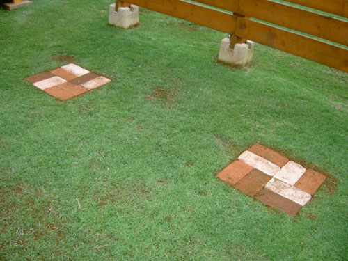 一番の目的はブロック。 フェンスを移動して2台の車が入るようになって 芝の位置にタイヤが乗り死んでしまった。 その位置を取り除きブロックを埋めた。 これで芝が死ぬのを防げる。