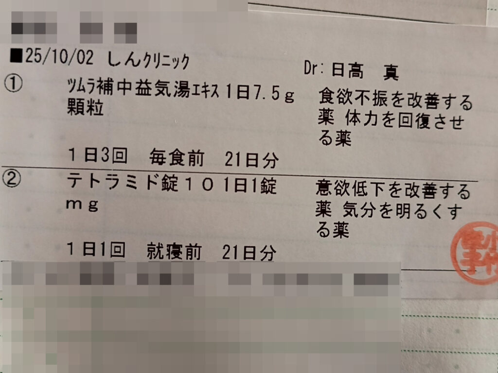 カテゴリー 日常 休み 投稿者 作成者: kiyoshi 投稿日 2025年10月3日 休み へのコメントはまだありません 2週間漢方薬を飲んだから 午前中に心療内科へ。 改善しないと言うと うつ病と診断され3週間分薬追加。 更年期も疑うなら泌尿器科と言われて 午後から違う病院。 説明をしてるだけで息苦しくなって 疲れてしまう。 こんな状態で仕事はできない。 男性用の検査キットがなくて 薬を勧められる。 薬剤師の許可がないと買えない薬。 今日も散歩。